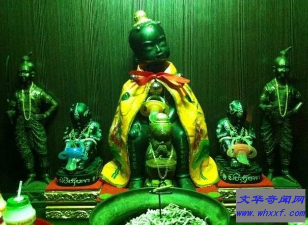 泰国是信仰佛教的国度,认为许多东西都是可以为自己带来好运的,除了普遍的佛牌之外,最为盛行的就是泰国镀金婴尸,据说是用婴儿的尸体制造而成的,就像印度的木乃伊一样,用镀金纸包裹起来,然后放在柜台上供养起来就能为自己带来好运,许多人把这种行为称为养小鬼!