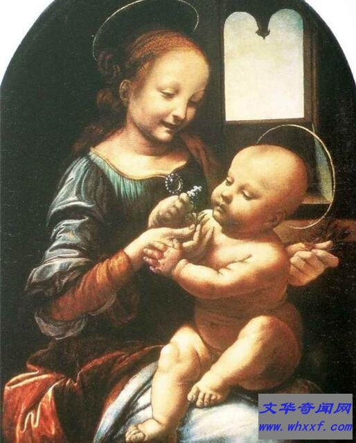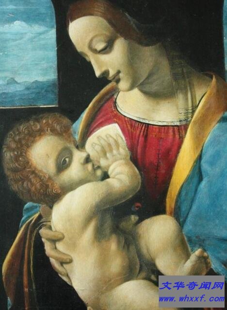 《母与子》这里画家更多强调的是一种母爱的普遍人性。形象丰满,神态恬静,洋溢着一种年轻母亲的温柔的爱子之心。但圣母的脸部仍显露出达芬奇所惯用的描绘公式,过分重视女性眼睛的块面结构(这在他以后的大量圣母像上都有表现)。