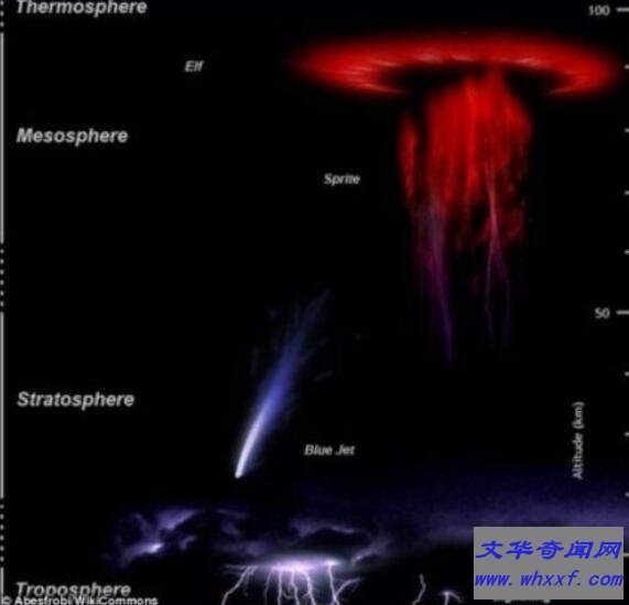 早在几十年前,有科学家发现在距离地面48~80千米距离的大气层中,有向上的闪电,也就是至下而上,不是劈向地面而是劈向大气层。这种闪电被叫做精灵闪电。这种闪电持续的事件非常短暂,只有三十分之一秒钟,也就是0.03秒左右,很难被捕捉到。