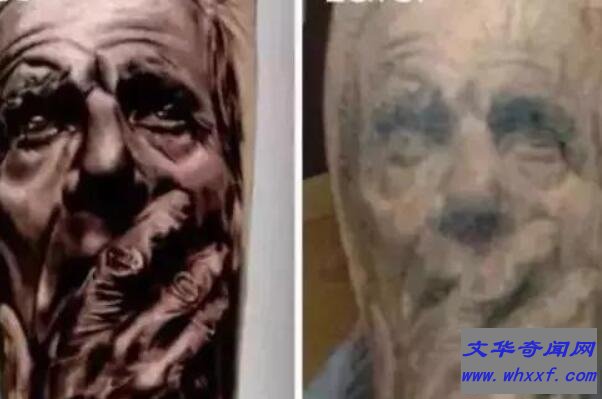 在年轻时每一个人的皮肤都是紧致的,在这样的皮肤上面进行纹身,能够最大效果的展示图片的精美,图片的内容与皮肤融合在一起非常的炫目,但是在老了之后,我们的皮肤开始产生了纹路,变得松弛就皱巴巴的,就像纸张经过多次折叠变皱一样,这个时候的纹身就看不出来它原本的图案模样,变得非常模糊,只是看得出它是五颜六色的,但是具体内容是完全看不清的。
