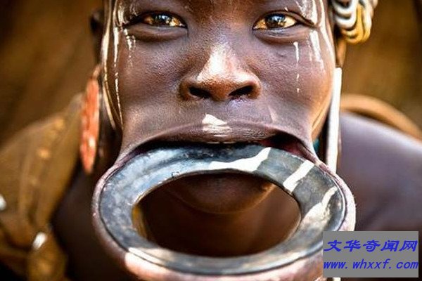 非洲还有一个盘唇族,当地的女性在8岁的时候,就要使用盘子将自己的嘴唇撑住,为了使盘子固定住,有些女孩子会拔掉几颗牙齿,以便盘子能够顺利放入嘴唇之中,每天24小时,除了吃饭的时候需要将其取下,睡觉的时候都会戴着,这在其他不理解的人眼光中,是一种非常痛苦的行为,而当地人认为是美的一种表现,盘子越大就越美。